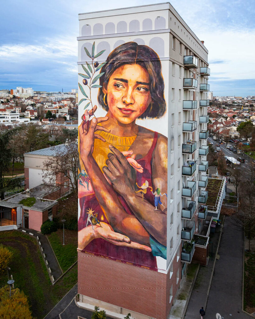Visuel : Fresque «Piel y Paz» signée de l’artiste Maria Peña Coto (« Mapecco »), réalisée sur la tour des Irlandais à Arcueil, en collaboration avec l’association Hypermur.