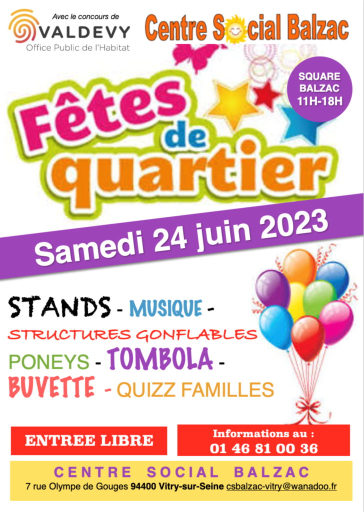 Valdevy et le Centre Social Balzac vous invitent le samedi 24 juin, à partir de 11h pour la fête de quartier au square Balzac !